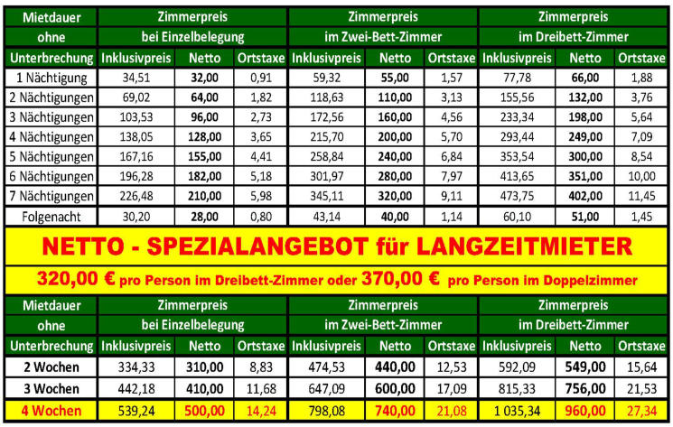 Die angeführten Preise sind reine Nächtigungspreise inklusive der Energiekosten, TV und Internetsowie der wöchentlichen Grundreinigung, jedoch ohne weitere Dienstleistung.Der Miet-Endpreis setzt sich aus dem Nettopreis plus der jeweils gültigen Mehrwertsteuerzuzüglich der Ortstaxe für Wien in der Höhe von 3,2% der Bemessungsgrundlage zusammen.Diese Preise gelten nur bei VORAUSZAHLUNG per Banküberweisung oder Barzahlung.Kredit- oder Bankomatkartenzahlungen können leider nicht angenommen werden.Es gelten die Allgemeinen Geschäftsbedingungen (AGBH 2006), diese werden auf Verlangen gerne ausgefolgt, beziehungsweise sind diese auf unseren Homepages einsehbar.Irrtum und Druckfehler vorbehalten.Gerichtsstand ist Wien